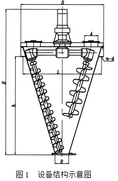 DSH型混合機(jī)結(jié)構(gòu)如圖1。主要由錐體、帶電機(jī)減速機(jī)、傳動(dòng)機(jī)構(gòu)、螺旋及出料閥等部件組成。在錐體內(nèi)安裝兩根螺旋,螺旋采用非對(duì)稱結(jié)構(gòu)。長(zhǎng)螺旋沿錐壁安裝,短螺旋靠近錐體中心部位安裝,且螺旋直徑比長(zhǎng)螺旋大。使用時(shí),兩螺旋作自轉(zhuǎn)的同時(shí)又沿錐壁作公轉(zhuǎn),即行星運(yùn)動(dòng)。該機(jī)使用特特征: