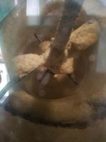 ② 設(shè)備夾套通入20°自來水冷卻,很快筒體內(nèi)部物料開始結(jié)晶,晶型飽滿類似鹽狀;