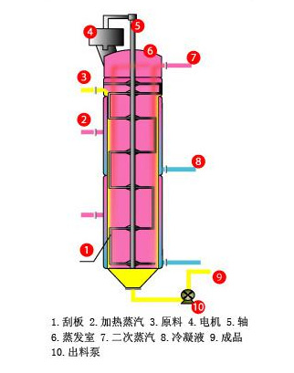 在濃縮過(guò)程液層很薄,溶液沸點(diǎn)升高可忽略,料液在加熱區(qū)域停留時(shí)間,隨濃縮器的高度(長(zhǎng)度)和刮板的導(dǎo)向角、轉(zhuǎn)速等因素而變化,一般在2秒~45秒左右。