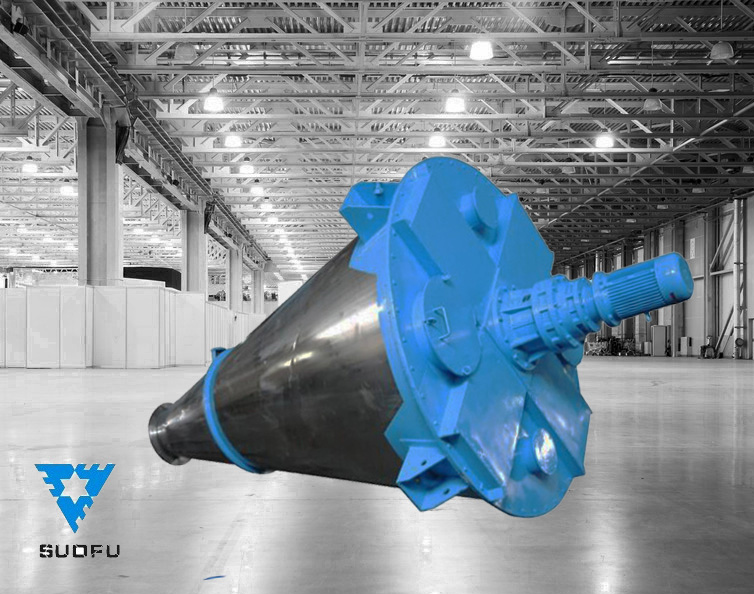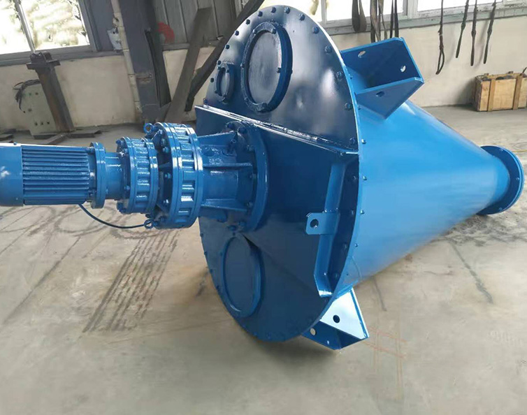 該機由擺線減速機直接驅動攪拌軸旋轉。攪拌軸由兩根與錐體吻合的螺帶及實心螺旋組成,旋轉時,螺帶將物料由下向上沿混合機錐體內(nèi)壁盤旋提升。同時又由于螺帶呈錐狀,運轉時帶面上的各點線速度不同,物料在其作用下產(chǎn)生了不規(guī)則的對流、剪切、摻混、擴散等,形成全方位的三維運動。攪拌軸的中心是一實心面體螺旋,在運轉時將靠中心的物料提升,拋出。被拋出的物料一部分進入螺帶,而被螺帶拋出的物料又被吸收到實心面體螺旋的包絡體內(nèi)而提升。如此不斷反復,使物料在極短時間內(nèi)達到均勻混合。