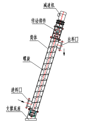 該機主要由減速機、傳動部件、筒體、螺旋、進料口、出料口、支撐底座等組成,如圖1所示。