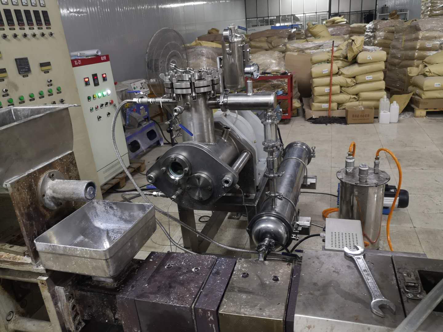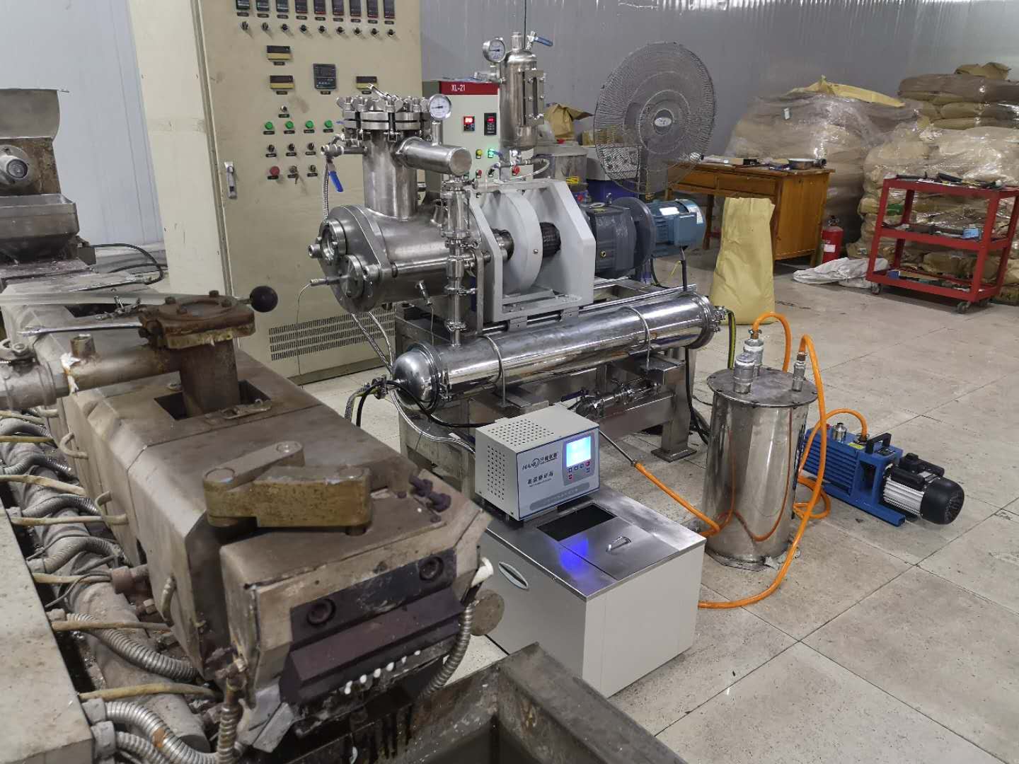 為了適應(yīng)在真空狀態(tài)下的操作,專門(mén)安裝了適用于高粘度物料的齒輪泵式出料器。該出料器直接安裝在主設(shè)備上,消除了設(shè)備內(nèi)的死角。齒輪泵式出料器在稍微超負(fù)荷的條件下工作,以保證物料能連續(xù)地排出,并輸入下一工段進(jìn)行包裝。