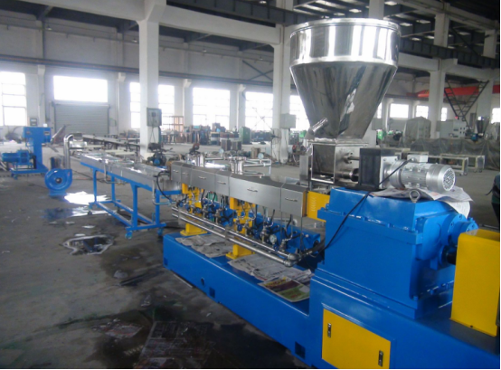 雙螺桿擠出造粒機(jī)工藝;原料稱重----配比----高混機(jī)----螺旋自動(dòng)上料機(jī)----雙螺桿造粒機(jī)-------冷卻水槽-------吹干機(jī)-------切粒