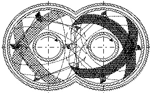 WZS型自清潔脫揮器為連續(xù)式操作,其由一個(gè)水平殼體和兩個(gè)水平軸組成。在8字形截面的殼體內(nèi),兩攪拌軸相互嚙合,雙軸同向旋轉(zhuǎn),同步轉(zhuǎn)速比為 xx:xx,分別為xx rpm(主軸)和xx rpm(清潔軸)兩個(gè)轉(zhuǎn)速(見圖1)。雙軸旋轉(zhuǎn)過程中所產(chǎn)生的動(dòng)態(tài)輪廓線確保了設(shè)備中無(wú)死角,即自清潔作用(見圖2)。為了在提供強(qiáng)力混合的同時(shí)又推動(dòng)物料(包括高粘度物料)逐漸前移,攪拌槳和U形捏合桿按螺旋狀排列,這種排列方式為高粘度的物料的軸向前移提供了推動(dòng)力,而且能阻止物料的反向流動(dòng),使物料在設(shè)備中的流動(dòng)接近平推流,從而提高了物料的脫揮效果。