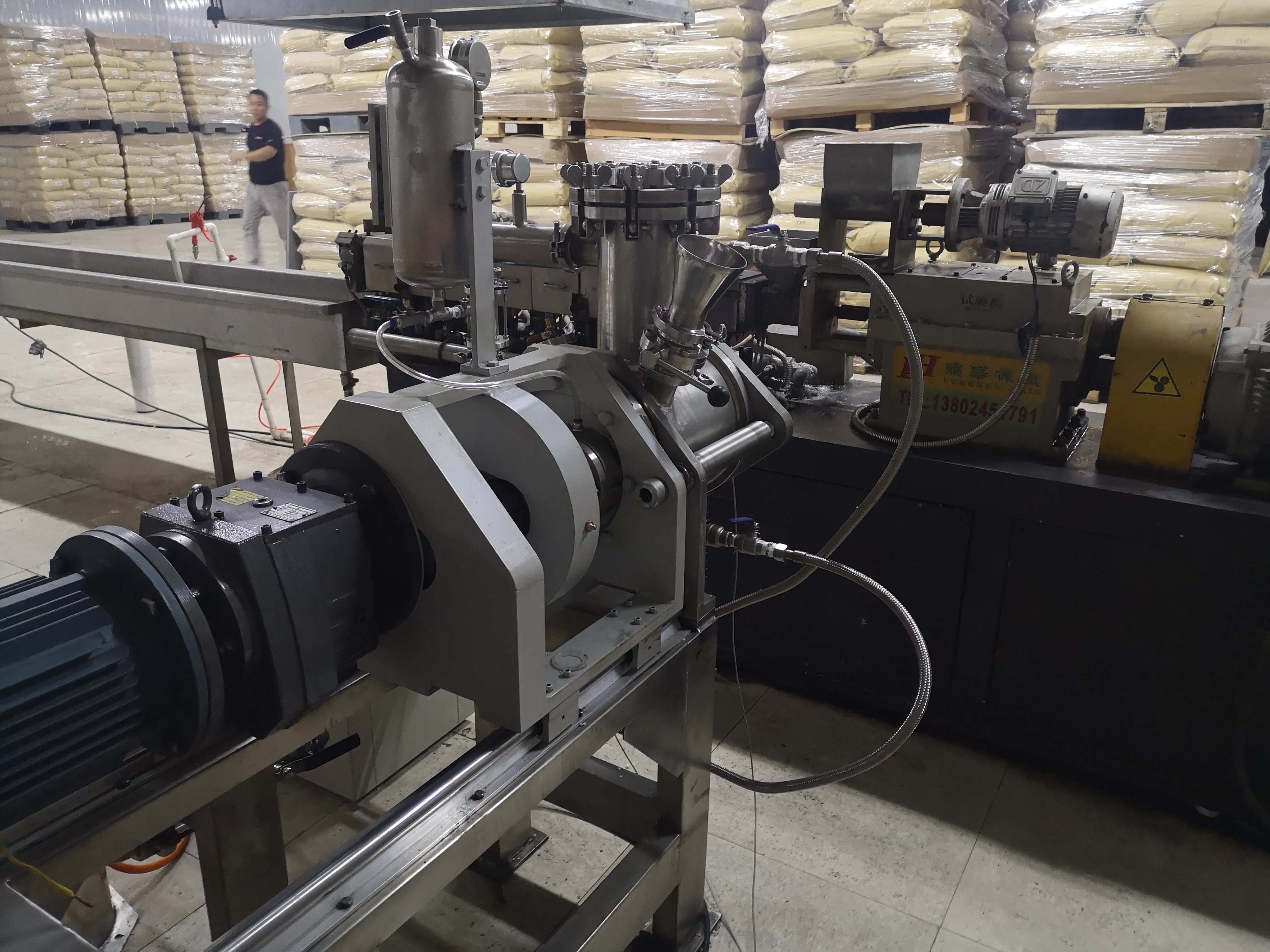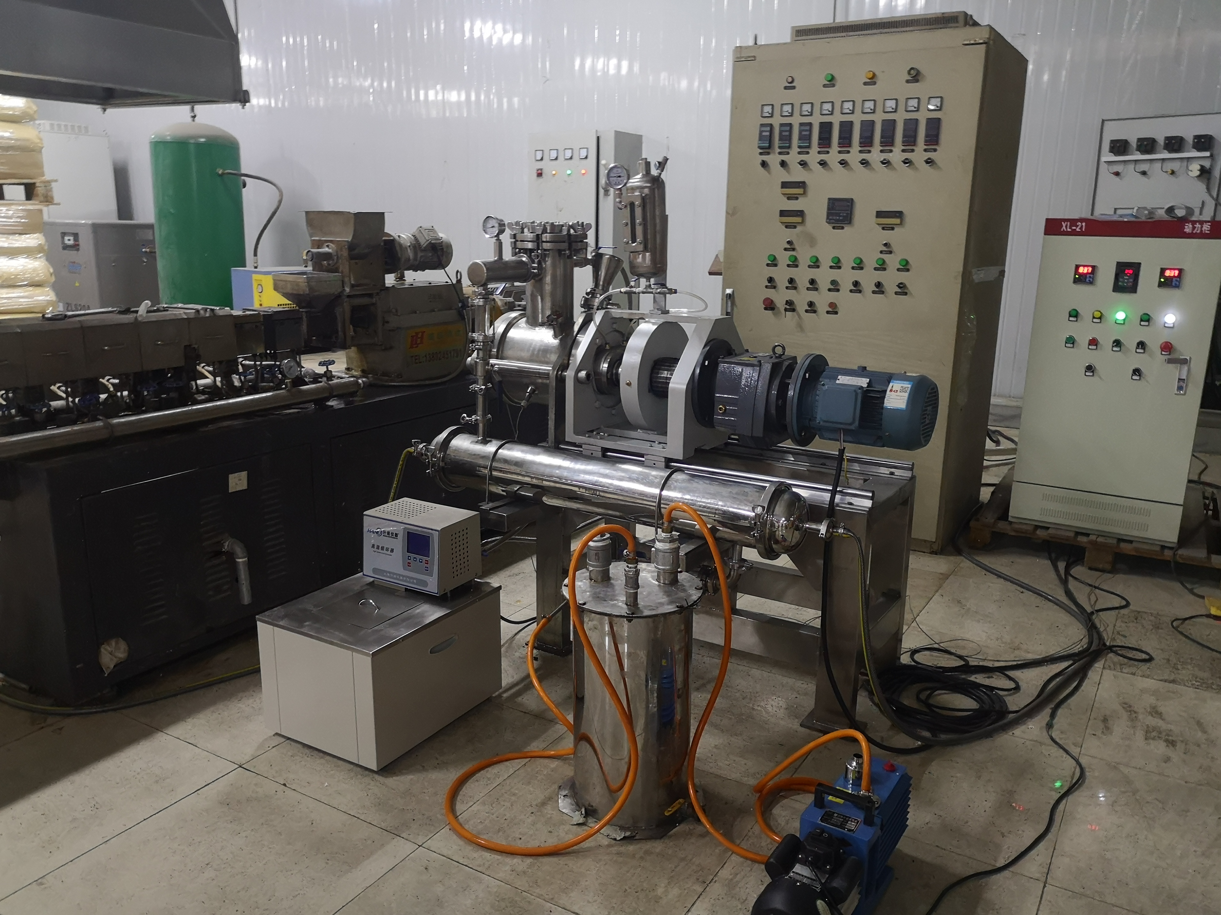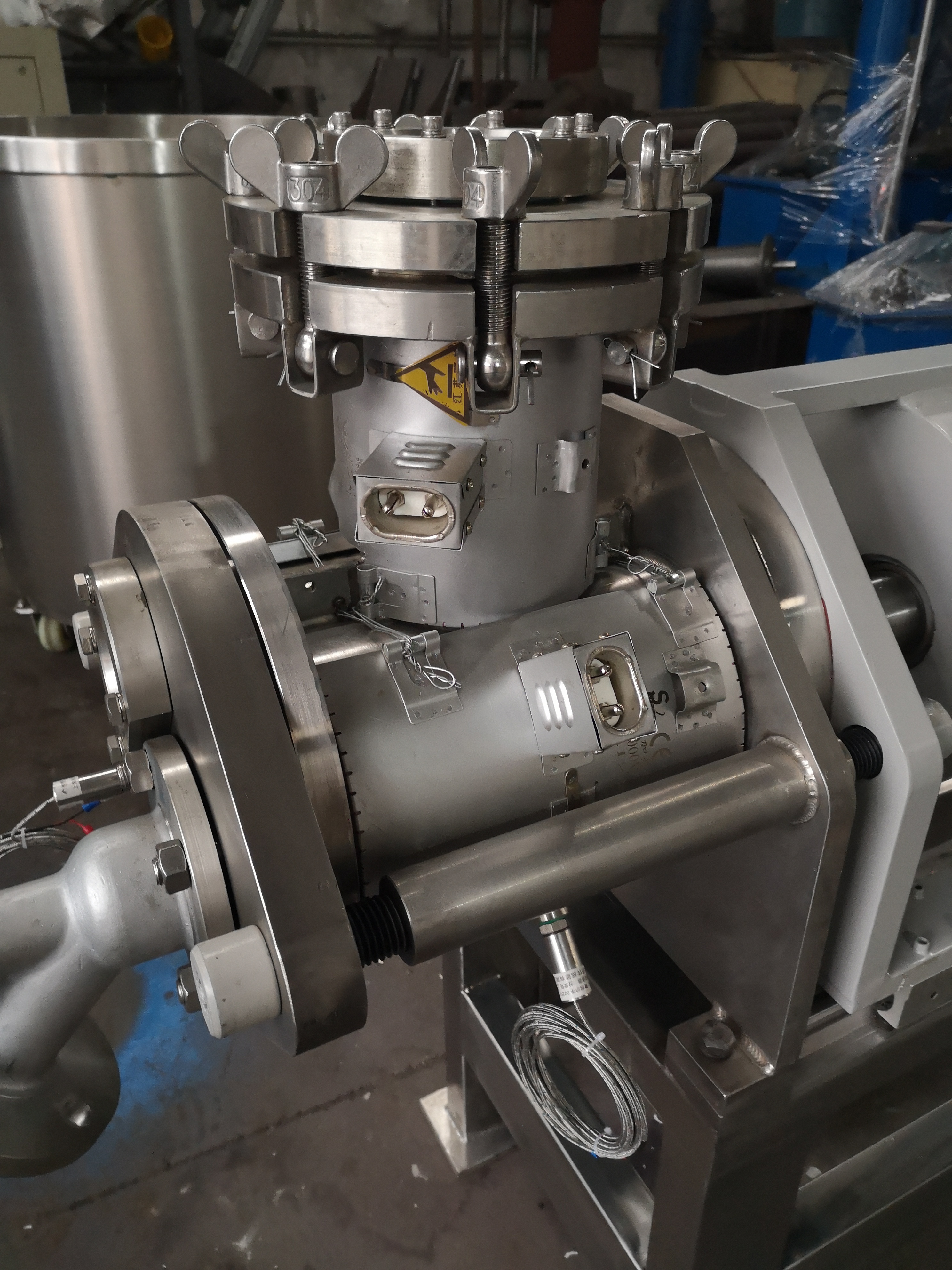 為了適應(yīng)在真空狀態(tài)下的操作,專門安裝了適用于高粘度物料的齒輪泵式出料器。該出料器直接安裝在主設(shè)備上,消除了設(shè)備內(nèi)的死角。齒輪泵式出料器在稍微超負(fù)荷的條件下工作,以保證物料能連續(xù)地排出,并輸入下一工段進(jìn)行包裝。