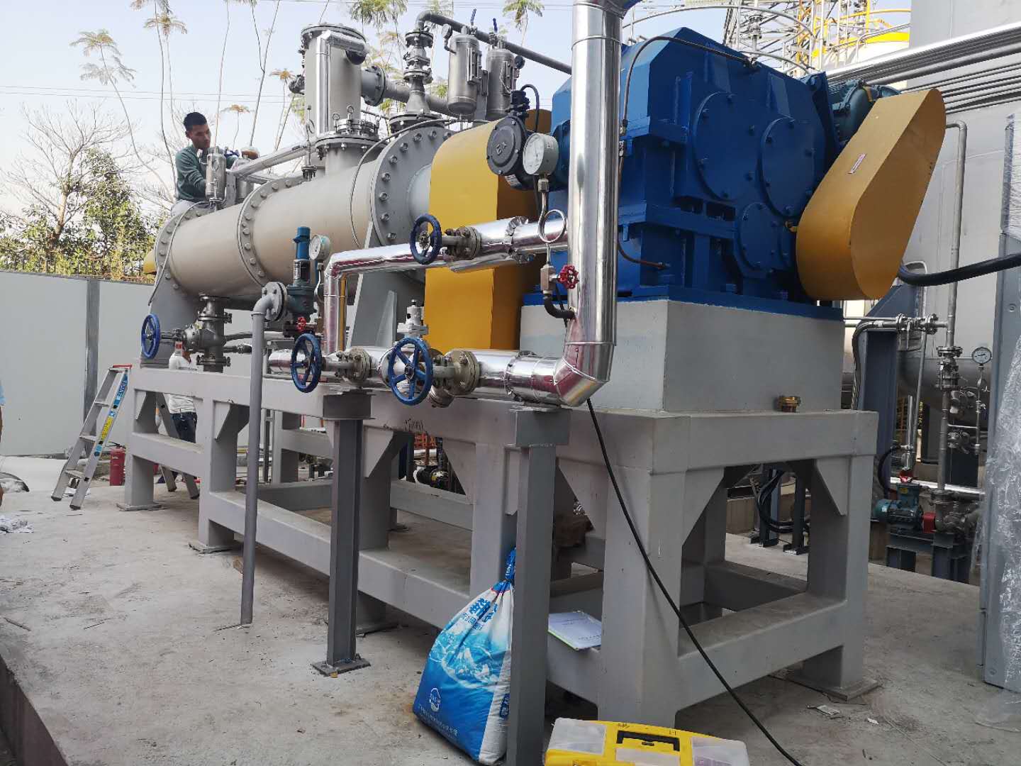 為了盡量增大單位設(shè)備容積的傳熱面積,WZS型自清潔脫揮器的殼體、攪拌軸和攪拌槳都通有導(dǎo)熱介質(zhì)。強力的混合和捏合作用能有效地使物料更快地表面更新,該作用與具有自清潔功能的傳熱面相結(jié)合,從而確保熱、質(zhì)傳遞所需的高表面更新速率。