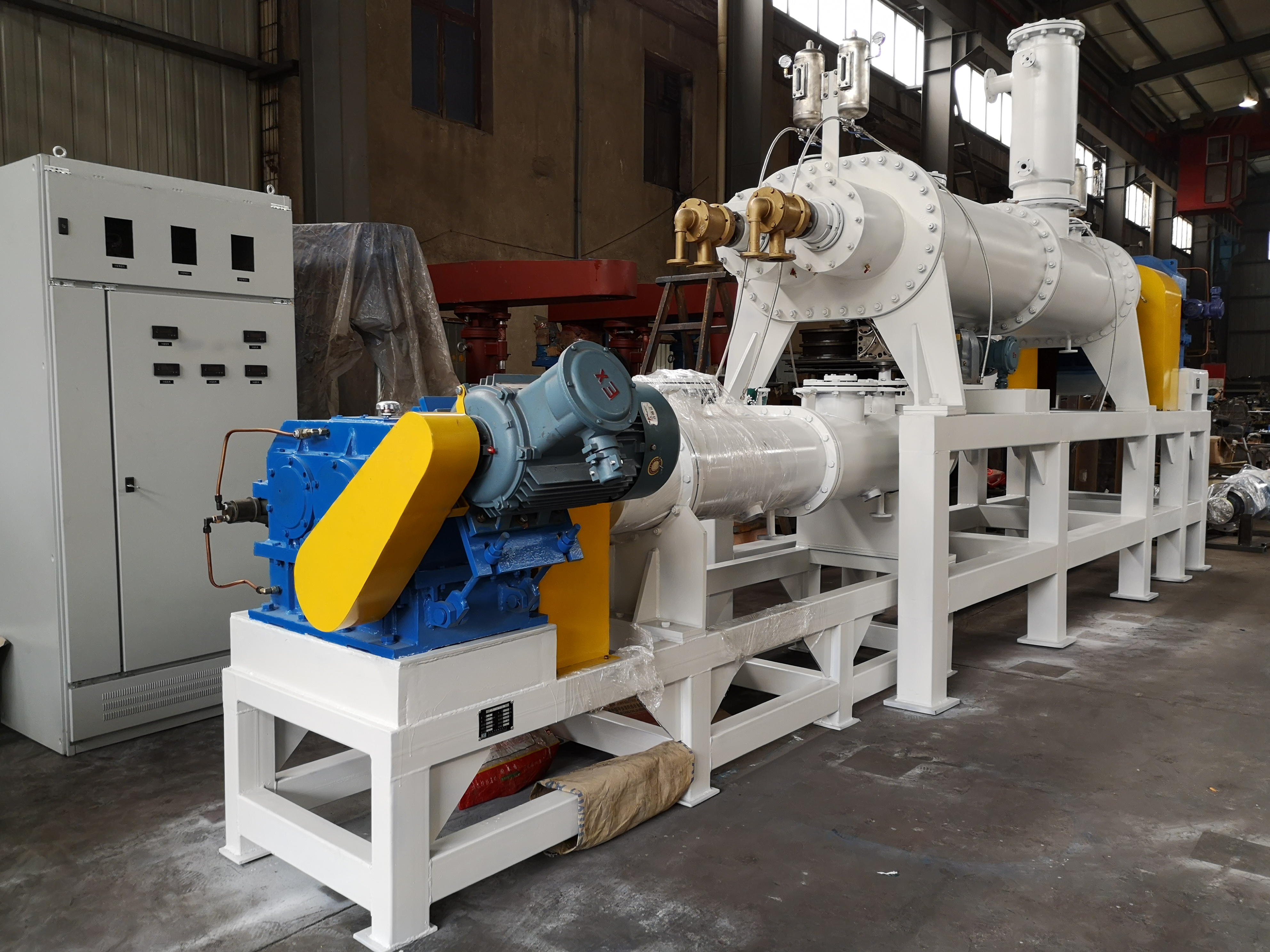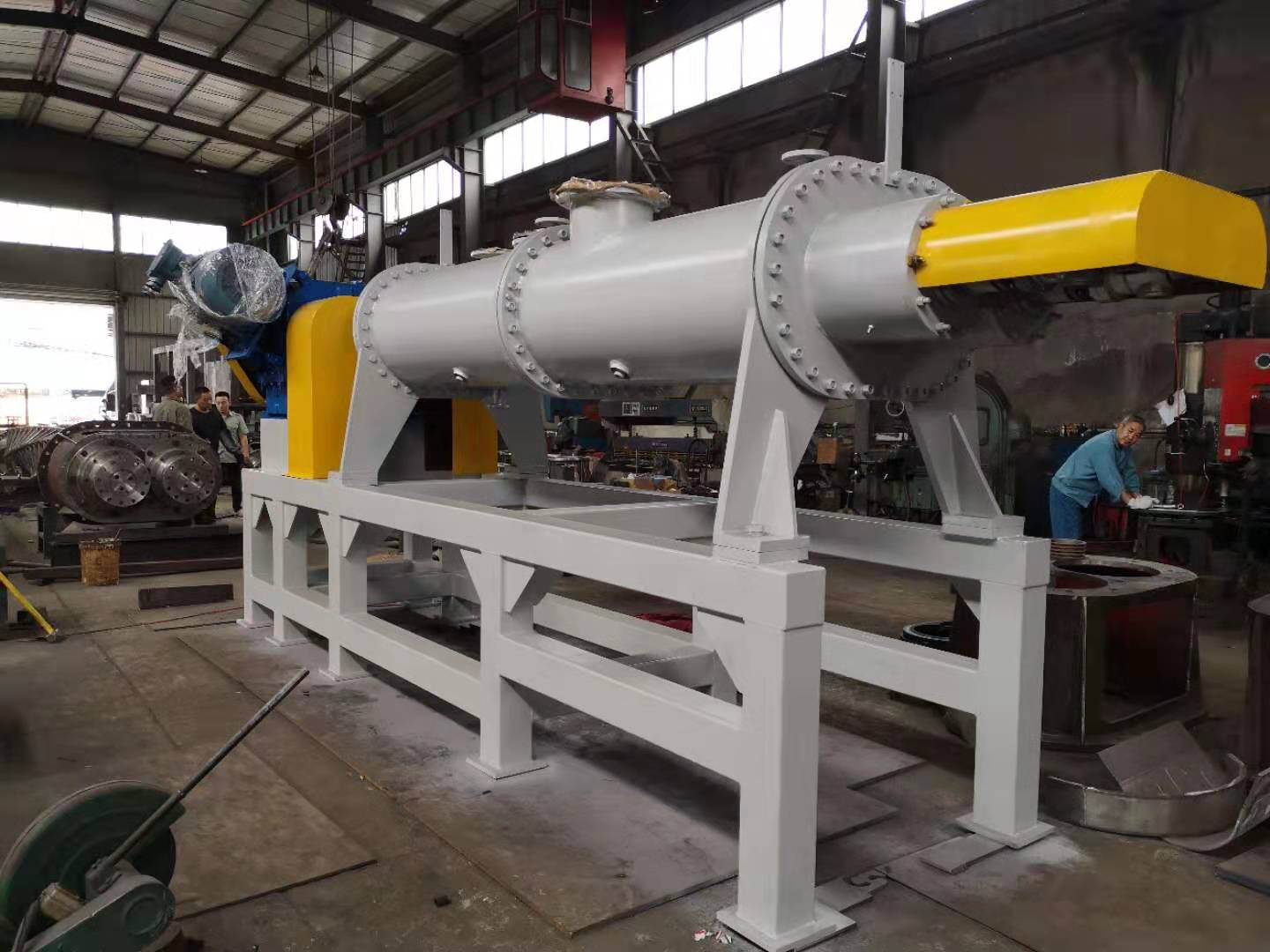 .混合機除夾套有傳熱功能,其主要的傳熱單元還是攪拌軸和攪拌盤,攪拌軸和槳盤中間設(shè)計是空心的,能通入0-300℃?zhèn)鳠峤橘|(zhì)循環(huán),加上攪拌軸的旋轉(zhuǎn),單位時間內(nèi)物料接觸換熱面積增加,使該混合設(shè)備具有高效的傳熱能力.是高粘流體物料反應(yīng),蒸發(fā),干燥,脫輝的首選裝置。