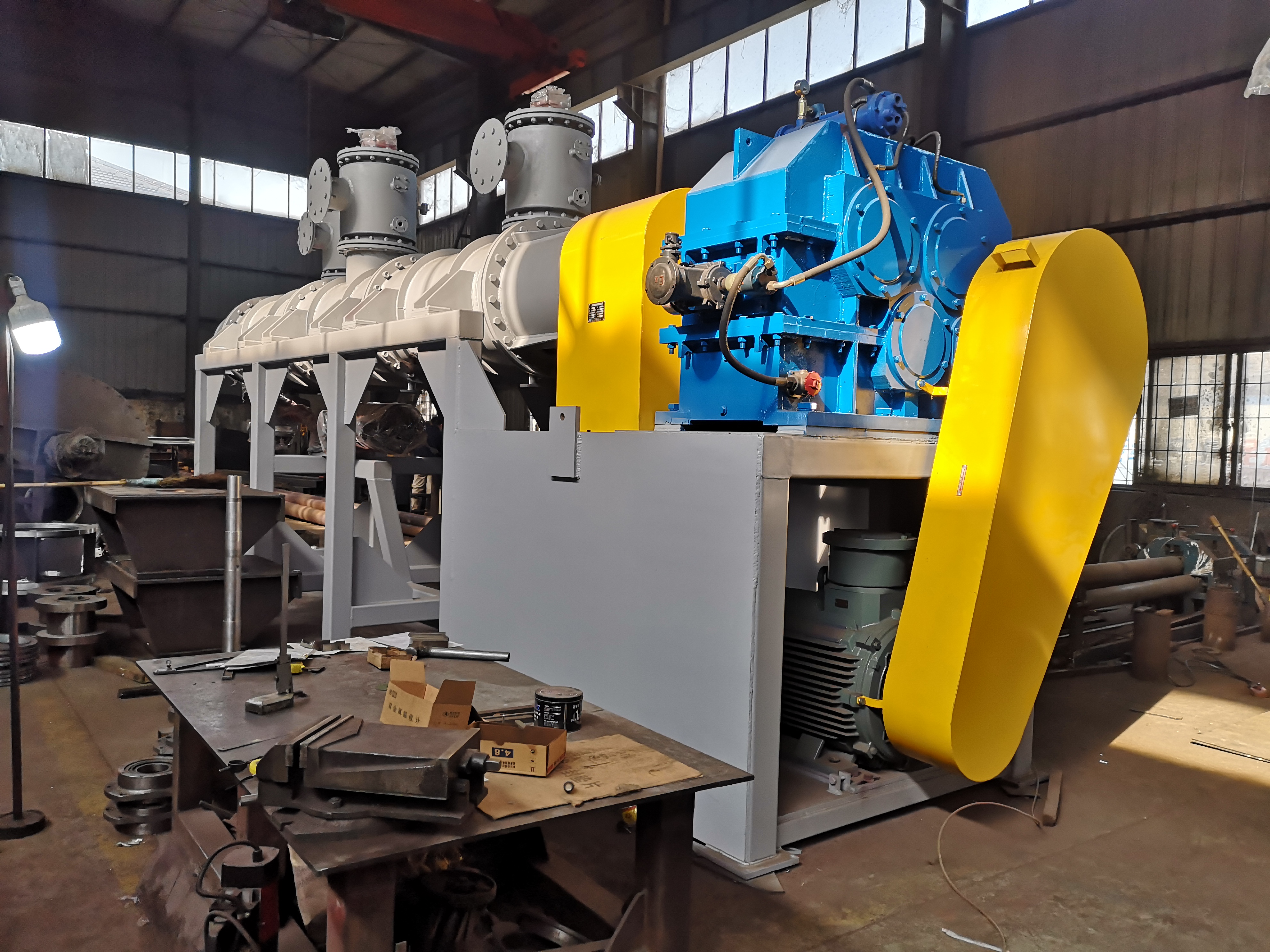 為了適應(yīng)在真空狀態(tài)下的操作,專(zhuān)門(mén)安裝了適用于高粘度物料的齒輪泵式出料器。該出料器直接安裝在主設(shè)備上,消除了設(shè)備內(nèi)的死角。齒輪泵式出料器在稍微超負(fù)荷的條件下工作,以保證物料能連續(xù)地排出,并輸入下一工段進(jìn)行包裝。