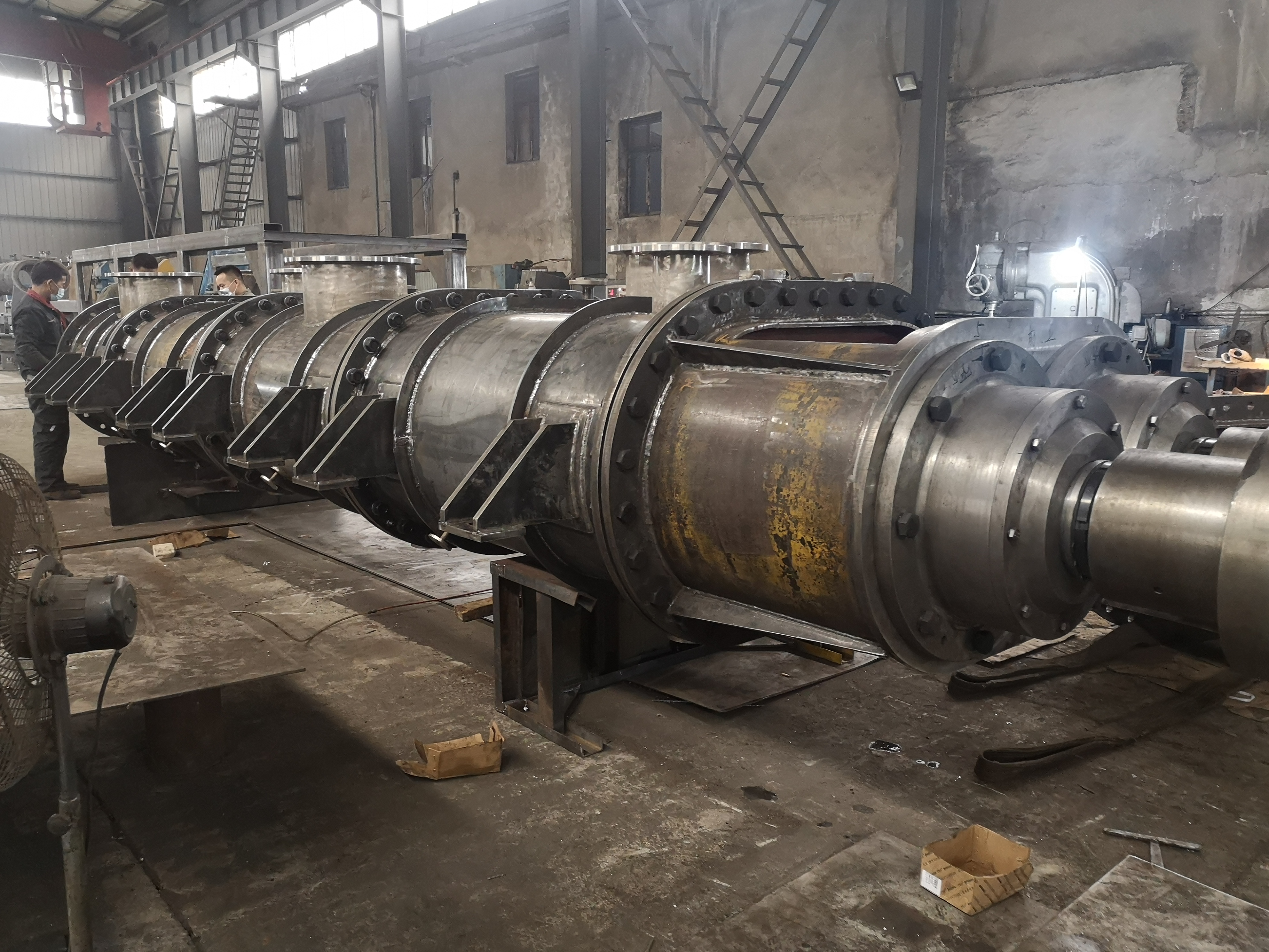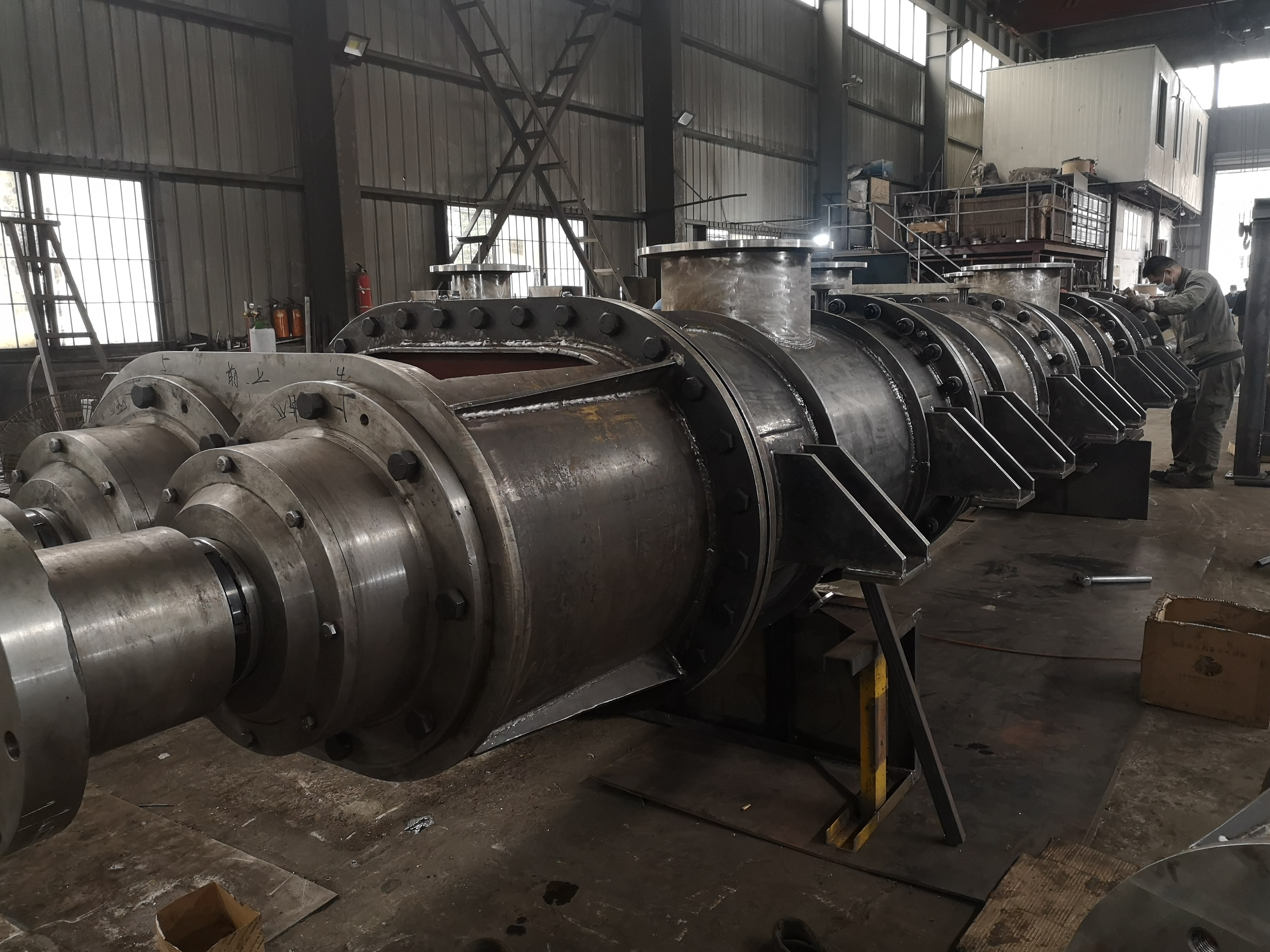 為了盡量增大單位設(shè)備容積的傳熱面積,WZS型自清潔脫揮器的殼體、攪拌軸和攪拌槳都通有導(dǎo)熱介質(zhì)。強(qiáng)力的混合和捏合作用能有效地使物料更快地表面更新,該作用與具有自清潔功能的傳熱面相結(jié)合,從而確保熱、質(zhì)傳遞所需的高表面更新速率。