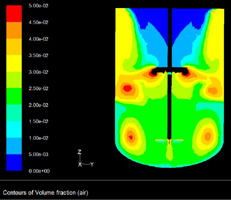 5. 利用下層寬葉仿曲面軸流推進(jìn)槳大排量的循環(huán),將剛剛噴射出來的氣體,牢牢的壓制在釜體底部,同時也將釜底催化劑固相物料楊起,達(dá)到完全懸浮的狀態(tài);