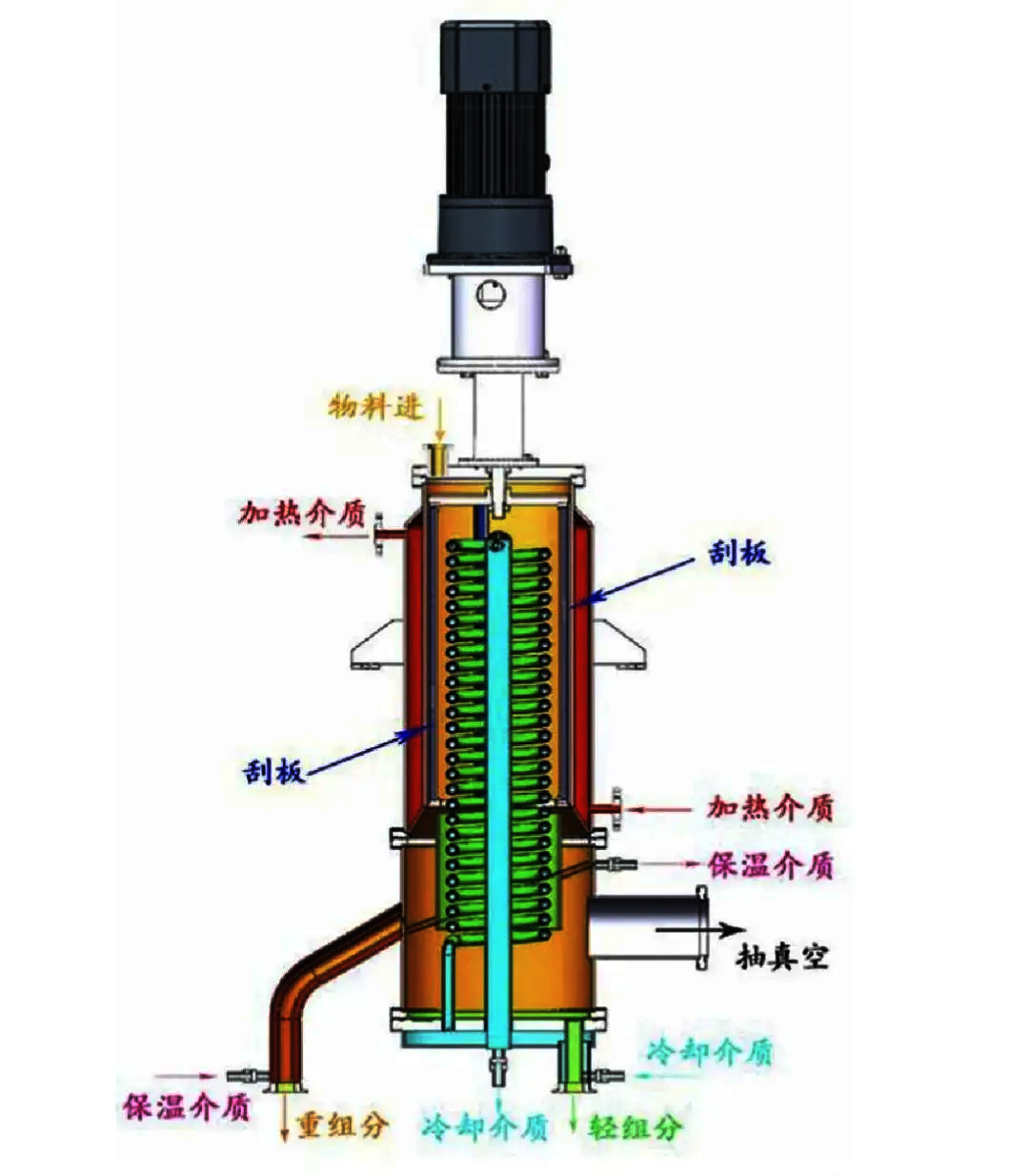 物料從上法蘭蓋進(jìn)入短程蒸餾器,通過(guò)轉(zhuǎn)子上的分配盤(pán)將物料連續(xù)均勻的分布到垂直的筒體加熱面上,物料靠重力下降的同時(shí),被旋轉(zhuǎn)的刮膜裝置在加熱面強(qiáng)制形成薄的湍流狀液膜。